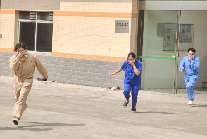 演練的第二部分模擬丸劑車(chē)間-2發(fā)生火災,車(chē)間主任王?,庱R上啟動(dòng)應急預案進(jìn)行人員緊急疏散,車(chē)間的義務(wù)消防隊員連接消防水帶試圖控制火勢未果。安全保衛部接報后,迅速派出義務(wù)消防隊進(jìn)行支援,隊員們背著(zhù)精良的裝備,風(fēng)馳電掣趕到現場(chǎng)分成兩隊開(kāi)展救援工作。滅火隊伍迅速接起消防水帶對火源進(jìn)行沖擊,和車(chē)間的義務(wù)消防隊員形成合力快速控制火勢。另一邊廂接報有員工被困火場(chǎng),兩名消防隊員迅速穿上正壓呼吸套裝,以便突入火場(chǎng)進(jìn)行搜救。在各位消防隊員的英勇奮戰下,火勢快速得到控制,車(chē)間人員也順利全部撤出,為整場(chǎng)演練交出了完美的答卷。